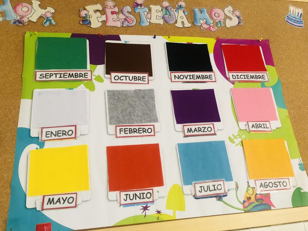 Y este es nuestro mural de clase de los meses del año en donde la seño nos pone nuestros nombres para saber de qué color es el de nuestro cumpleaños y en que color estamos de mes.